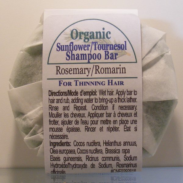 --Rosemary Sunflower Shampoo Bar-Composed of highly moisturizing, light oils, this soap is designed to wash clean leaving hair soft and tangle-free. Very popular with men. Dry hair types should consider using a conditioner after shampooing. Directions: Wet hair and rub bar against hair to deposit soap. Using your hands, work lather through the hair and rinse. Repeat. (Always shampoo twice, once to lift dirt and excess oil, then to remove it and deposit conditioning oils.) Keep out of eyes. Travels well.